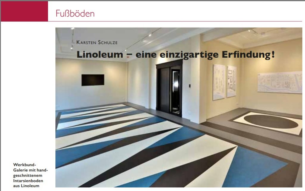 Bodenleger-Profi Karsten Schulze von KS Bodenbelagsarbeiten GmbH aus Berlin-Kreuzberg schreibt in einem Fachartikel des Magazins „Restaurator im Handwerk, Ausgabe 3/2019, Thema: Fußböden“ über einen Lieblings-Werkstoff seiner Firma: Linoleum.